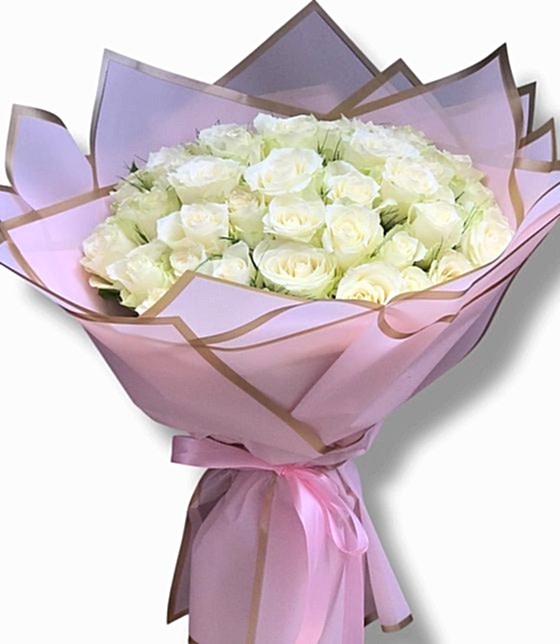 Pembe fon kağıtları ile hazırlanan 50 adet beyaz gül buketi.