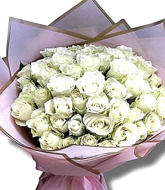 Pembe fon kağıtları ile hazırlanan 50 adet beyaz gül buketi.