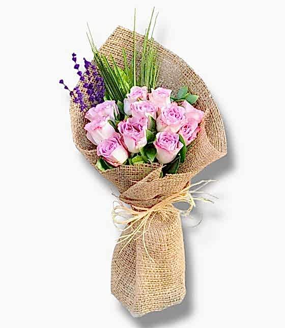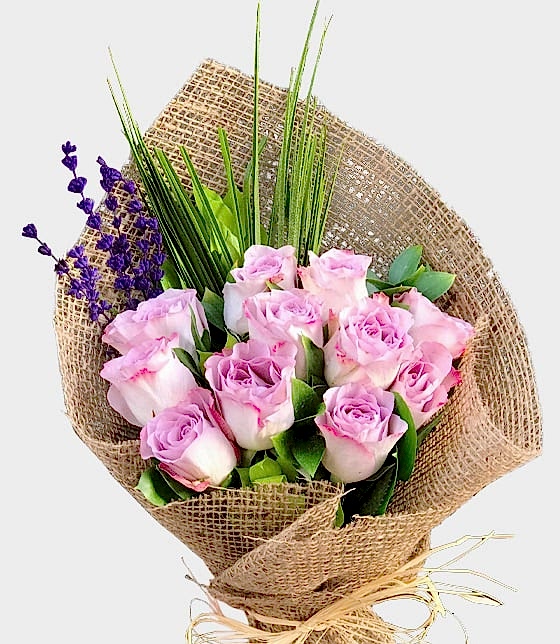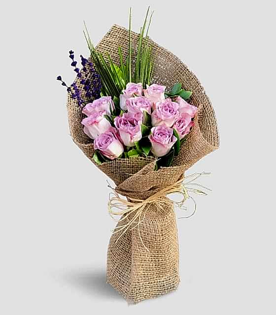 Lavanta ve feniks yaprakları ve 11 adet lila gül ile hazırlanan lila gül buketi