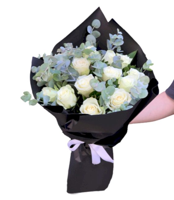 Siyah fonlu okaliptus yeşillikleri ile hazırlanan 15 adet beyaz gül buketi