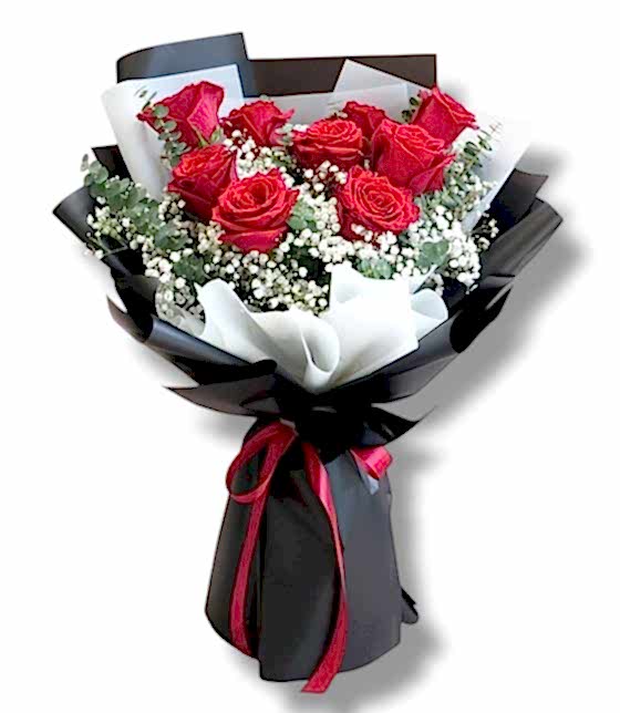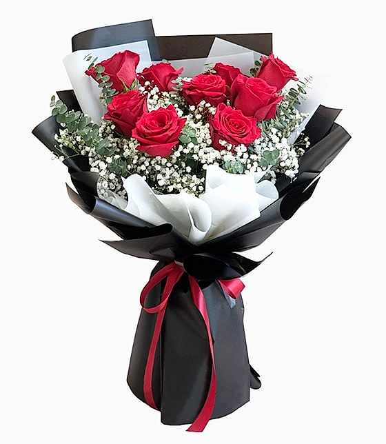 40 cm ve üzeri güller, okaliptus ve cipsofilyalar ile hazırlanan siyah ve beyaz fonlu 9 adet kırmızı gül buketi