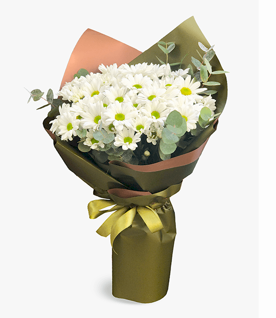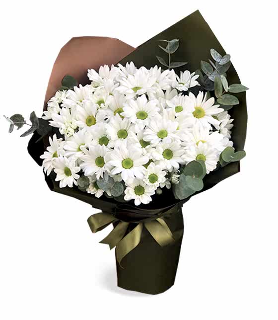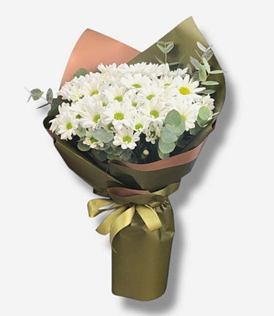 Okaliptus yaprakları ile hazırlanan  yeşil fon ile hazırlanan 7 dal beyaz papatya buketi