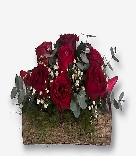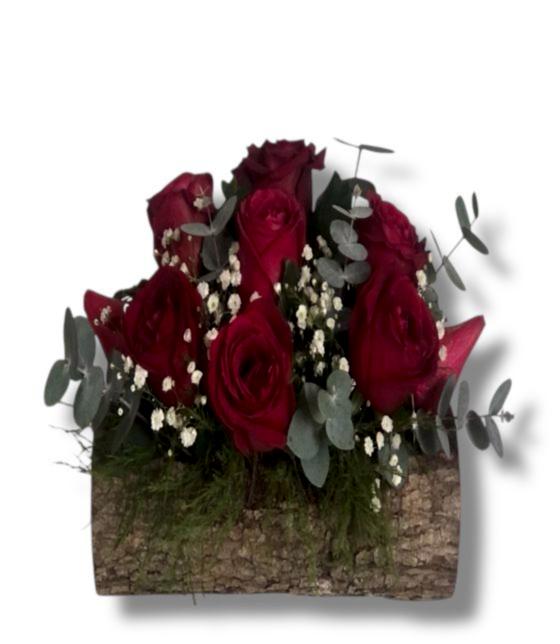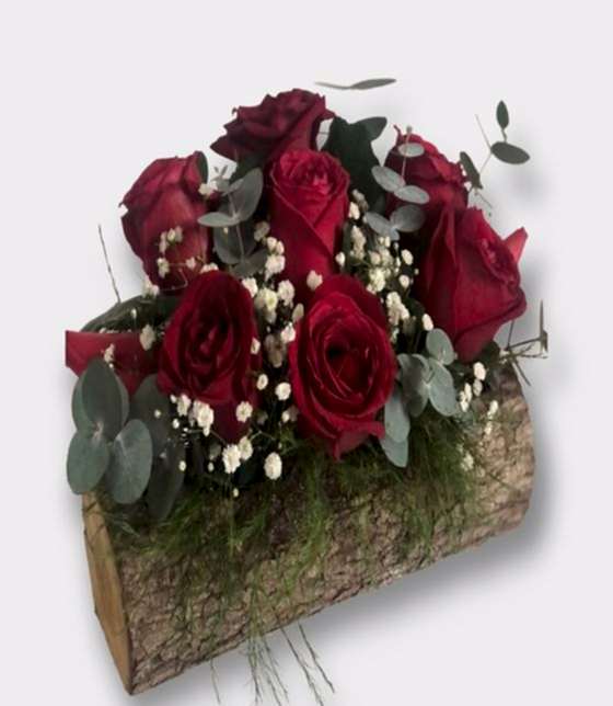 Doğal Ahşap Kütükte 9 Adet Kırmızı Gül
