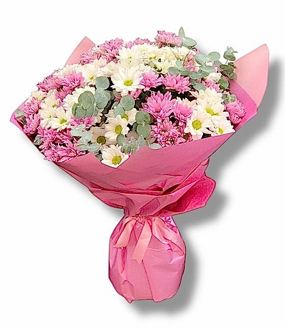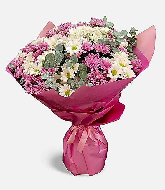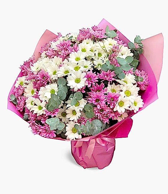 Dekoratif okaliptus yeşillikleri, pembe papatyalar ve beyaz papatyalar ile hazırlanan kucak dolusu pembe beyaz papatya buketi