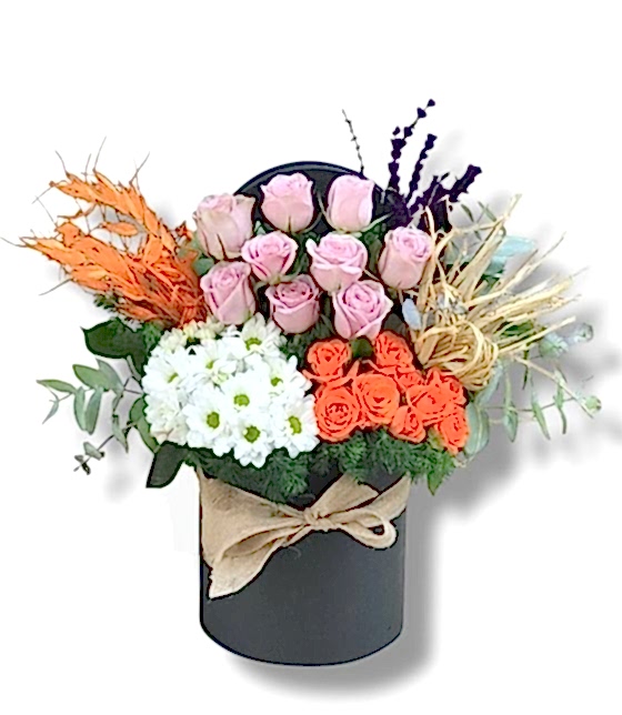 Yuvarlak kutuda lila güller, turuncu çardak gülleri, beyaz papatya ve kuru çiçekler ile hazırlanan huzur esintisi canlı çiçek aranjmanı
