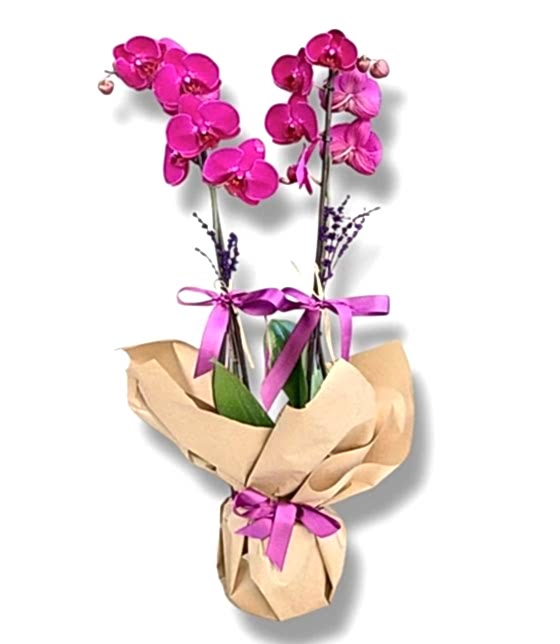Doğal renk kraft kağıdı ve lavantalar ile hazırlanan iki dallı mor orkide çiçeği