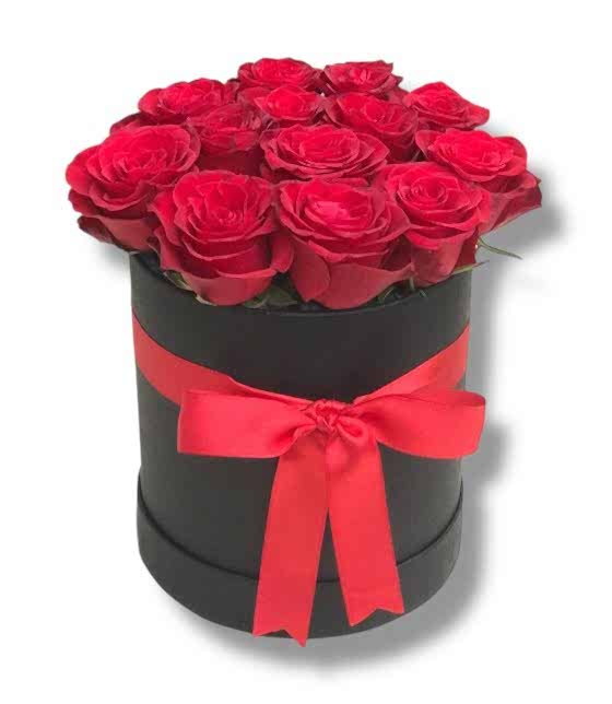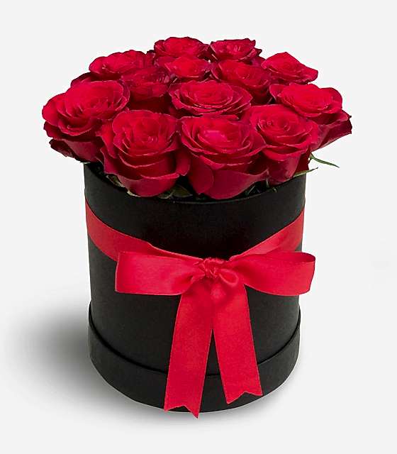 Yuvarlak siyah kutuda 13 adet kırmızı gül ile hazırlanan gül aranjmanı
