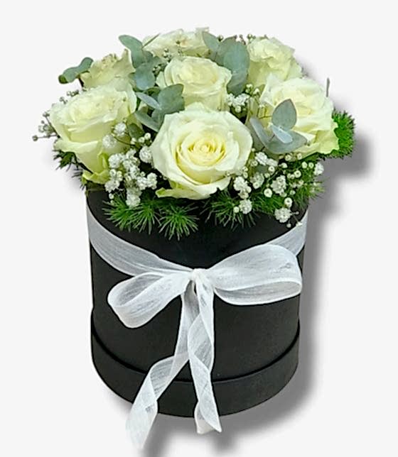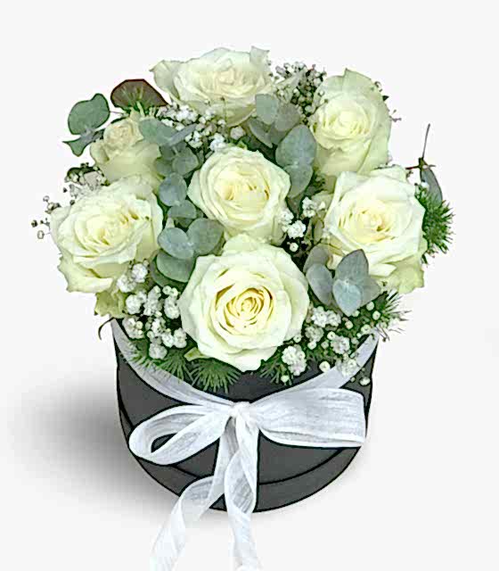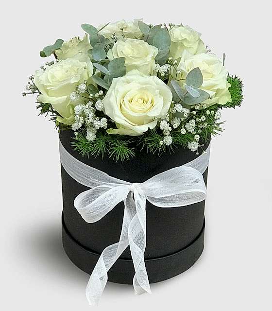 Yuvarlak siyah kutuda okaliptus ve cipsofilyalar ile hazırlanan 7 adet ithal beyaz gül aranjmanı