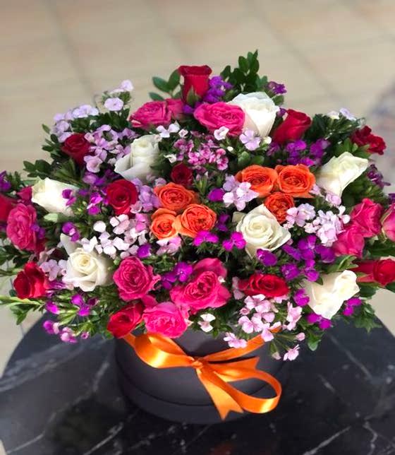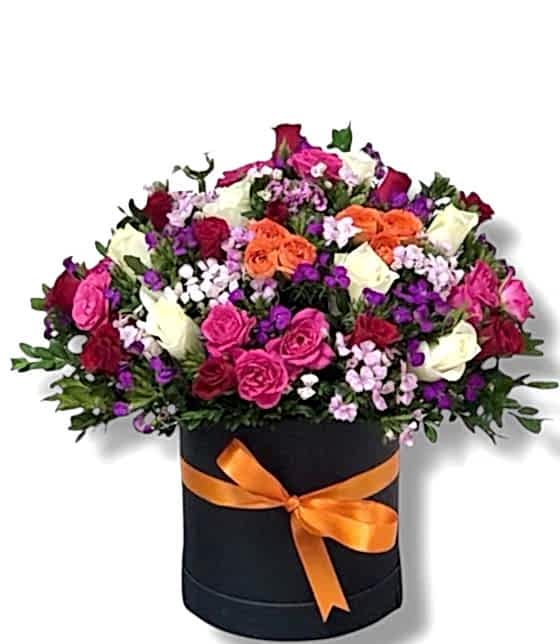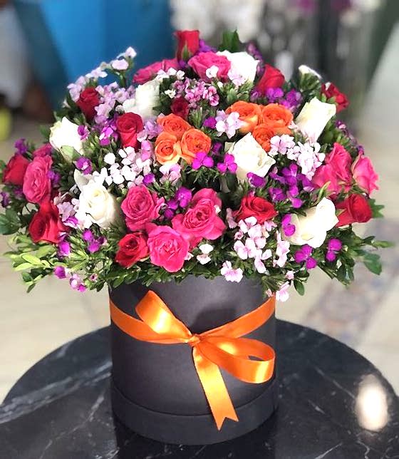 Siyah kutusunda taze çiçekler ile hazırlanmış renkli güller ve hüsnü yusuf...