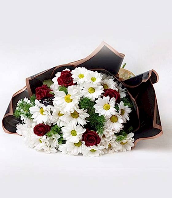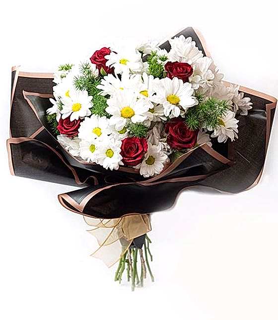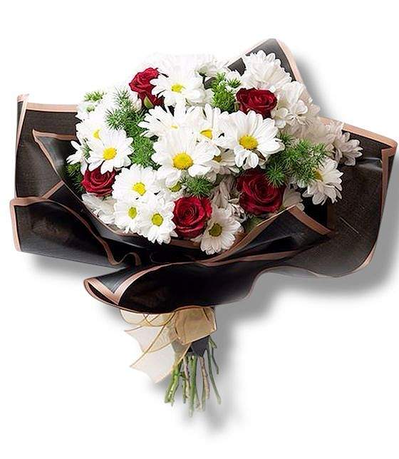 Siyah ambalajında hazırlanmış beyaz papatyalar ve kırmızı güller...