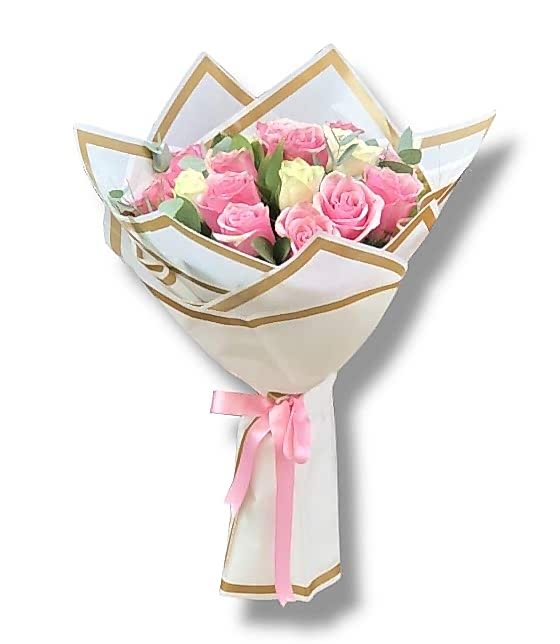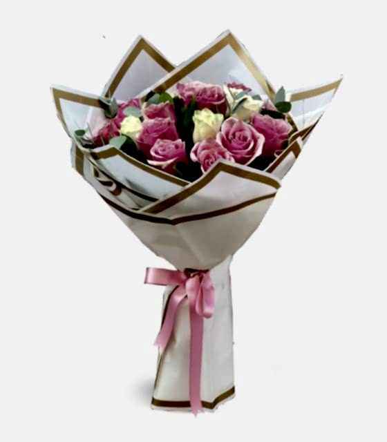 Çevresi beyaz fon kağıdı ile çevrili pembe beyaz güller ile hazırlanan 15 adet gül buketi.