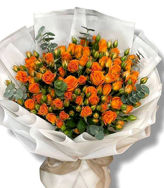 Beyaz ambalajında 40 dal turuncu çardak güller ve okoliptus yaprakları..