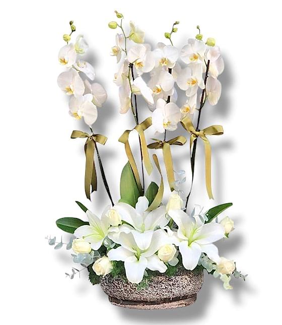 Dört dal beyaz orkide, beyaz lilyum ve beyaz güller ile hazırlanan zarif orkide aranjmanı